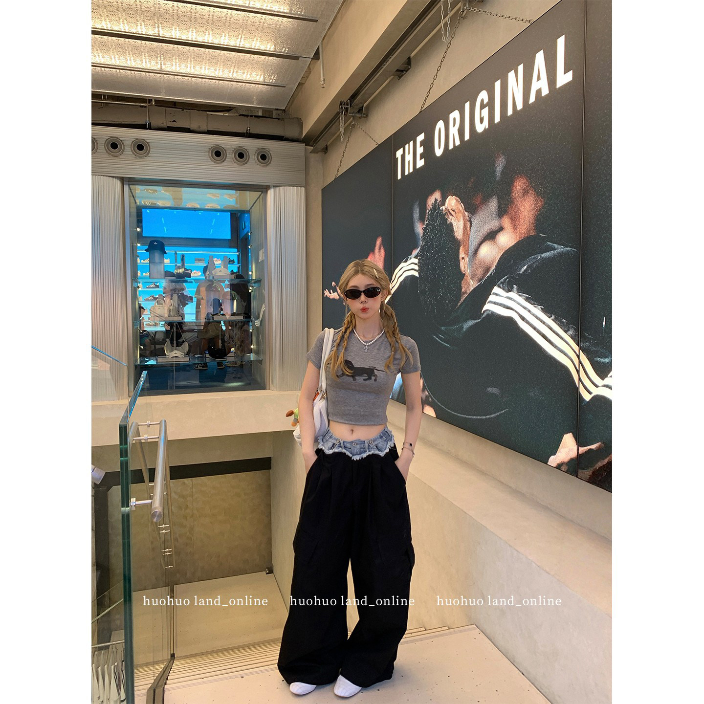 大码美式复古多口袋拼接工装牛仔裤男女水洗做旧宽松休闲直筒长裤