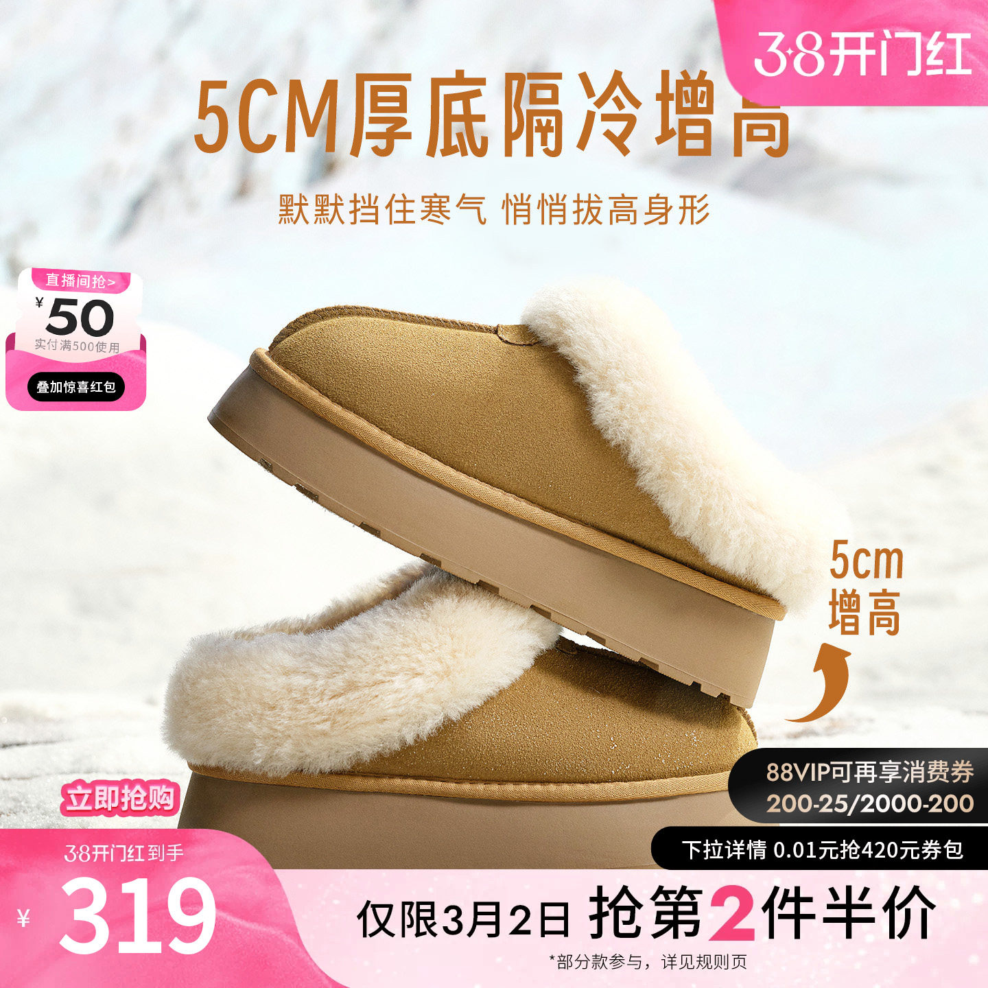 COZY STEPS可至25新女保暖厚底增高雪地靴舒适百搭羊皮毛一体靴子
