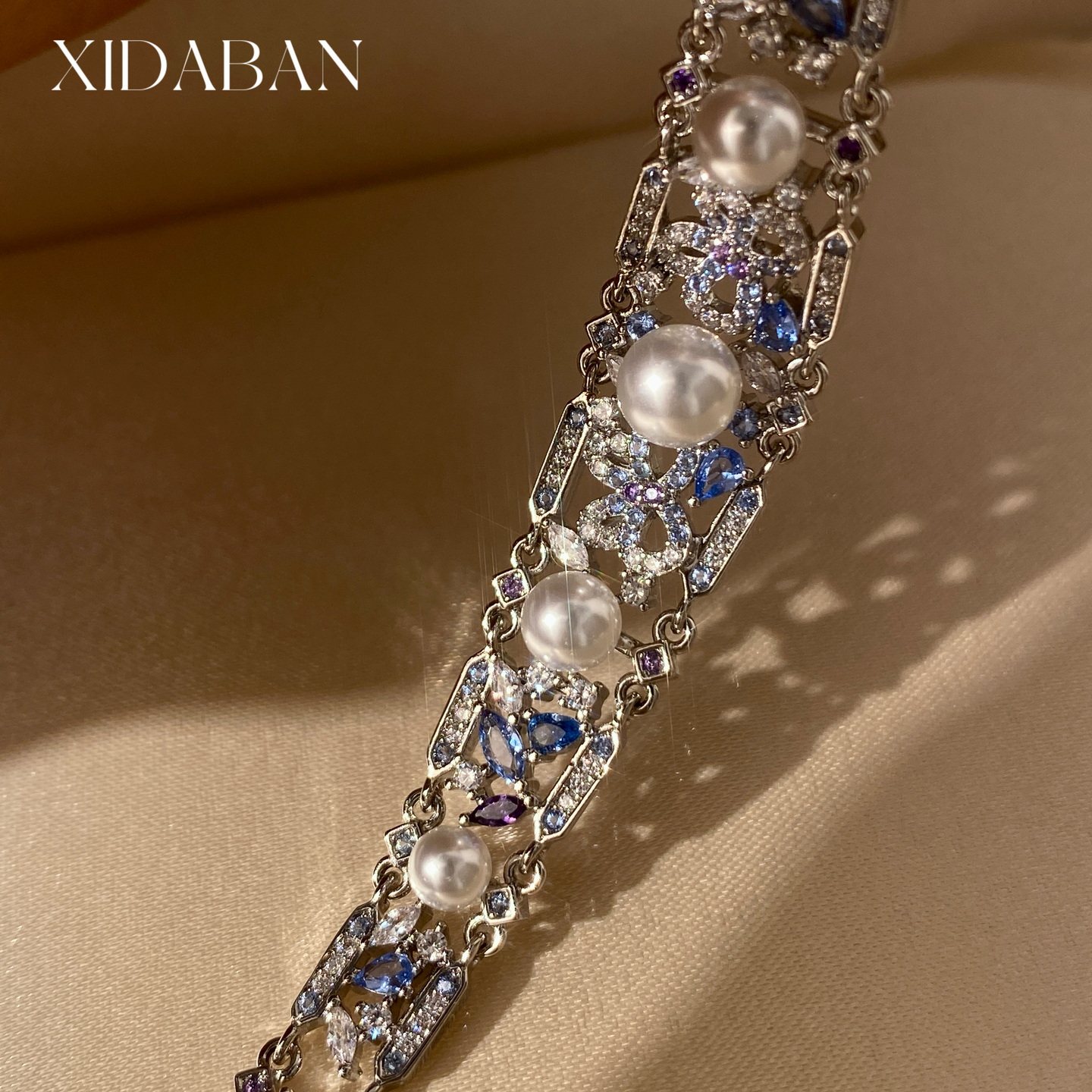 淘宝轻奢复古宫廷风人造澳白珍珠蓝宝石手链镶满钻高级感可调节手饰女