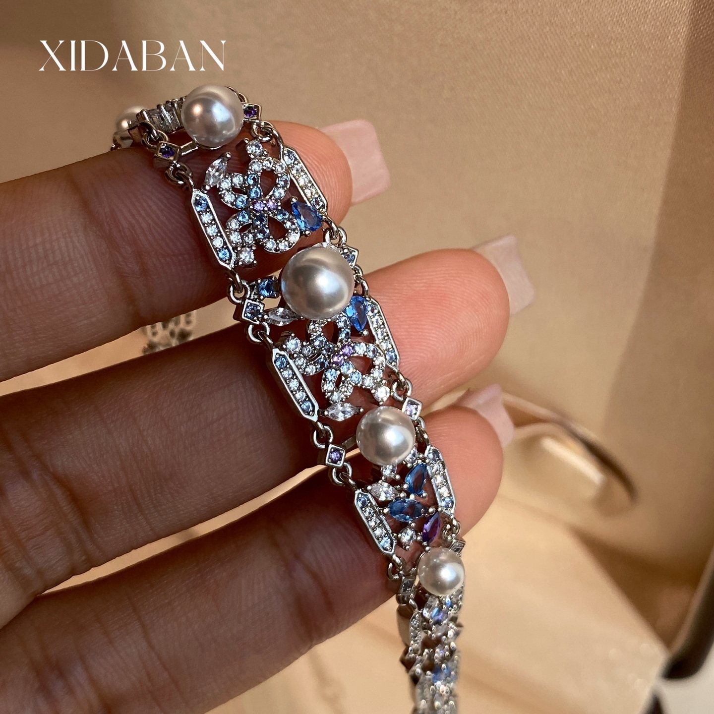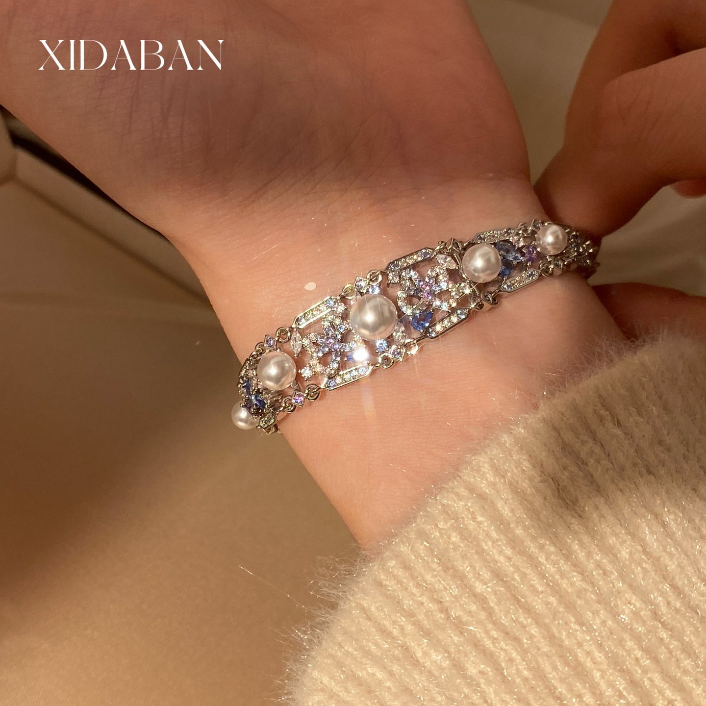 这款轻奢复古宫廷风手链,融合典雅与奢华,以人造澳白珍珠为主石,温润光泽尽显高级质感。周围镶嵌璀璨蓝宝石,搭配密镶闪耀碎钻,宛如星河环绕,彰显贵族气息。精工细作的复古宫廷设计,细节考究,线条流畅,散发浓郁欧式古典韵味。可调节链扣设计,适配不同手腕尺寸,佩戴舒适且实用。无论是日常搭配还是出席重要场合,都能瞬间提升整体气质,展现女性优雅与自信。是追求品质与美感的现代女性不可或缺的精致配饰,兼具收藏与佩戴价值。