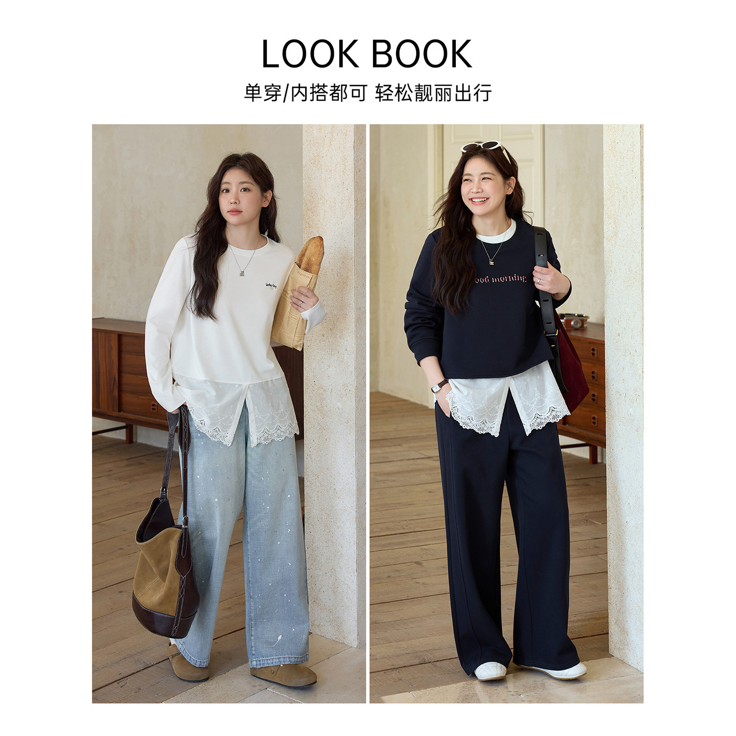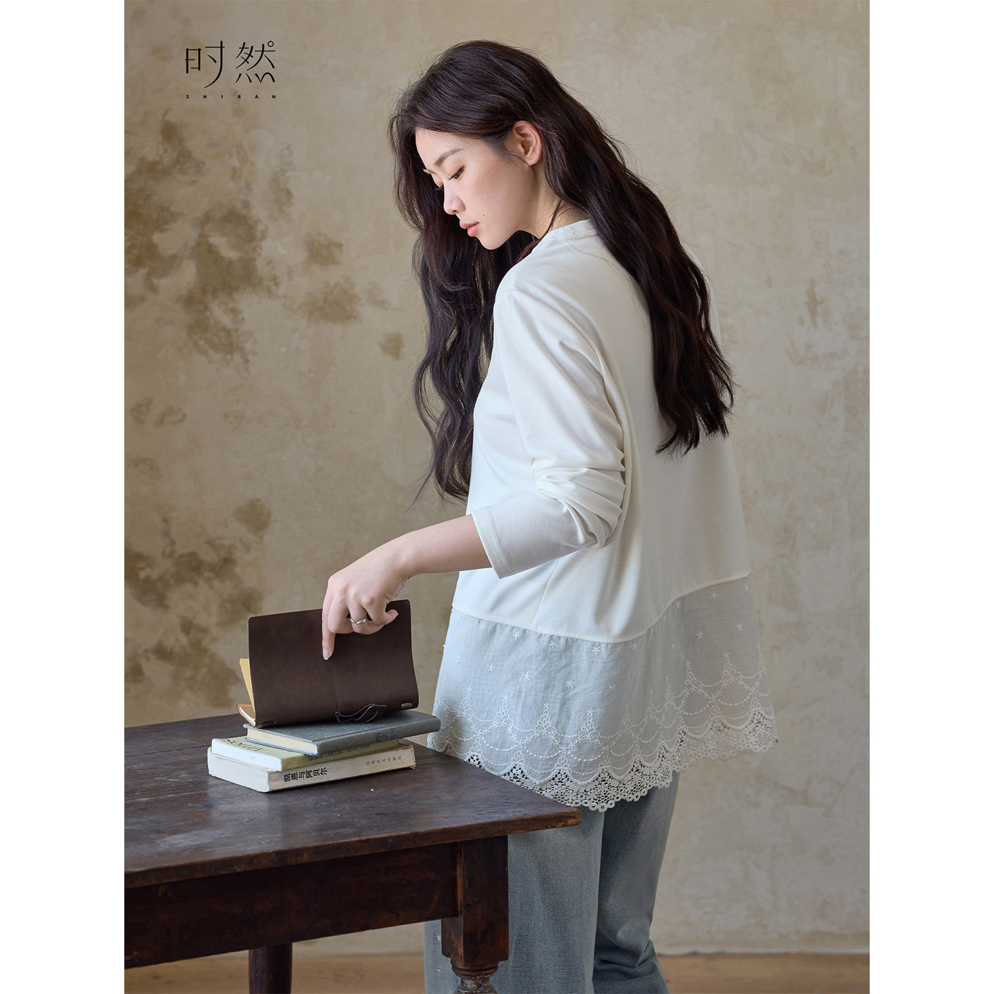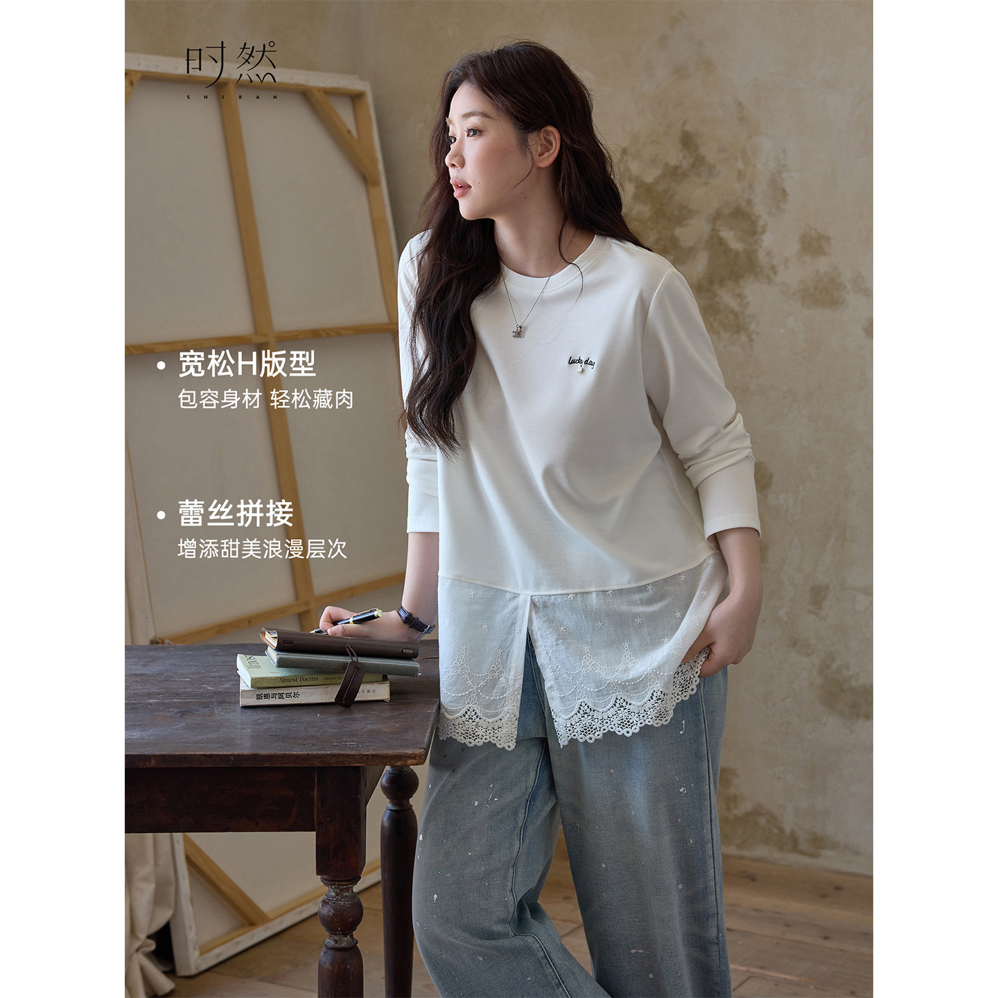 天猫时然大码女装蕾丝宽松T恤26春季新款胖mm显瘦莱赛尔圆领长袖上衣