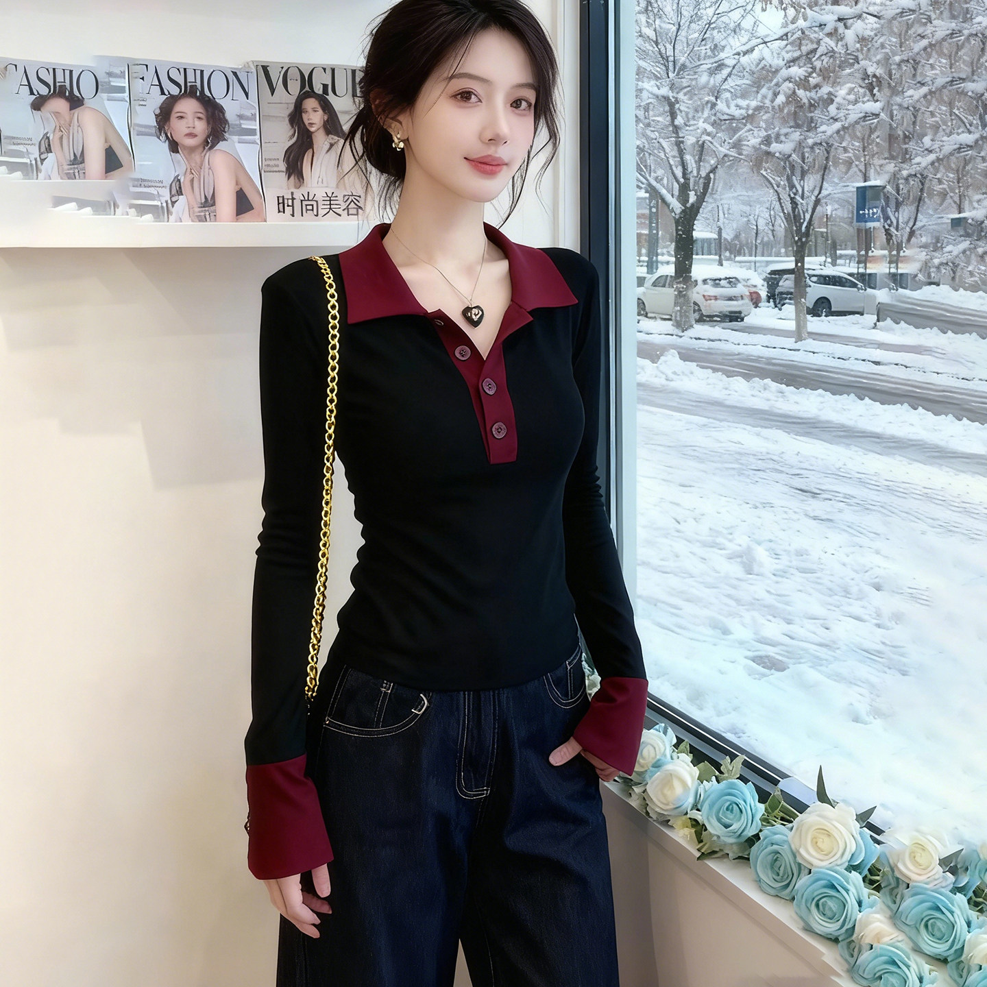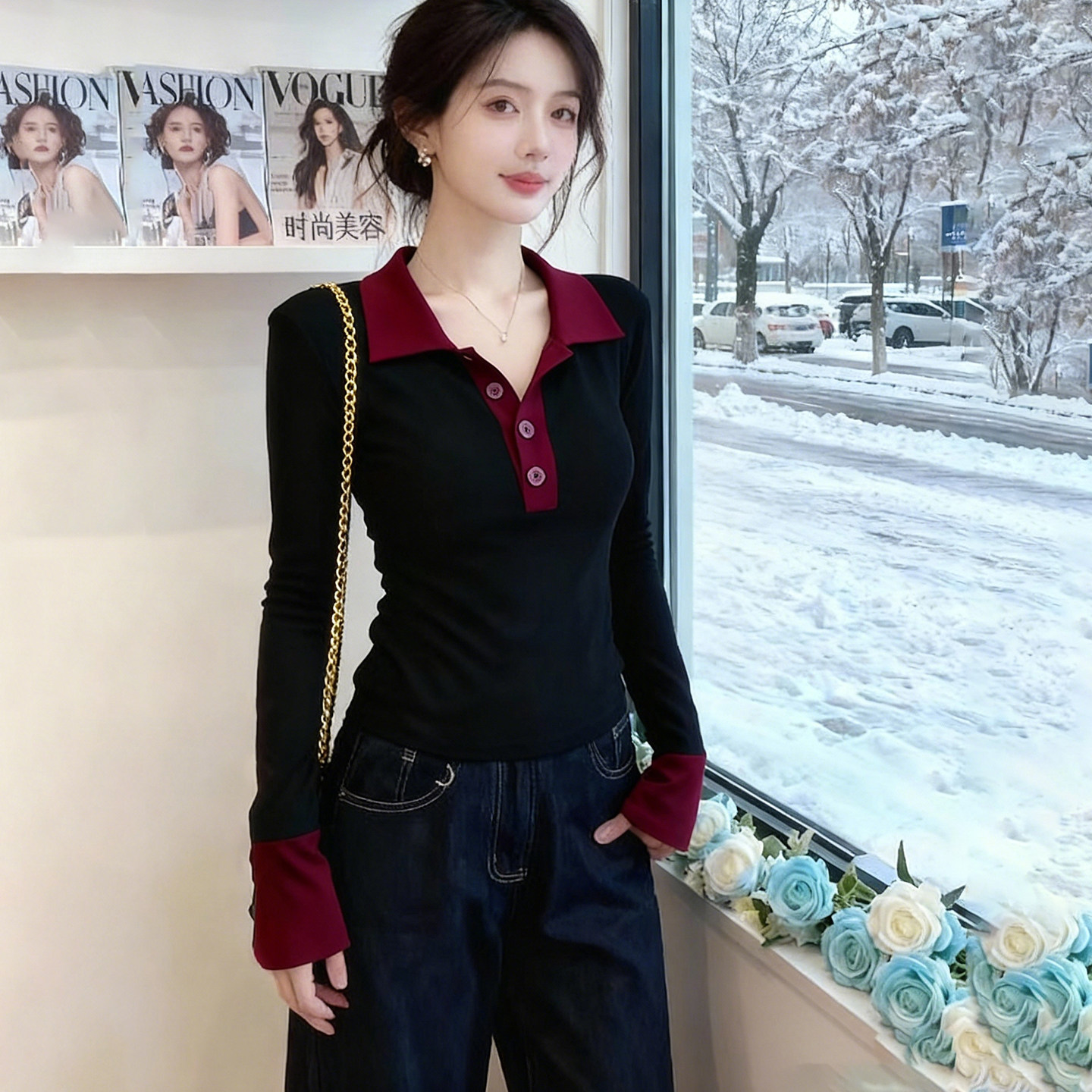 这款秋季新款性感纯欲Polo领拼色长袖T恤,采用修身剪裁设计,巧妙贴合女性曲线,显瘦又显气质。经典Polo领口搭配精致纽扣,增添几分干练与优雅,同时展现若隐若现的锁骨线条,散发纯欲魅力。大胆的拼色设计打破单调,视觉层次丰富,时尚感十足。选用柔软亲肤面料,透气舒适,适合贴身内搭或单穿。无论是搭配牛仔裤、半身裙还是外套,都能轻松驾驭日常通勤或休闲约会场合。简约而不失设计感,是今秋不可或缺的百搭打底衫,轻松穿出高级感与女人味。