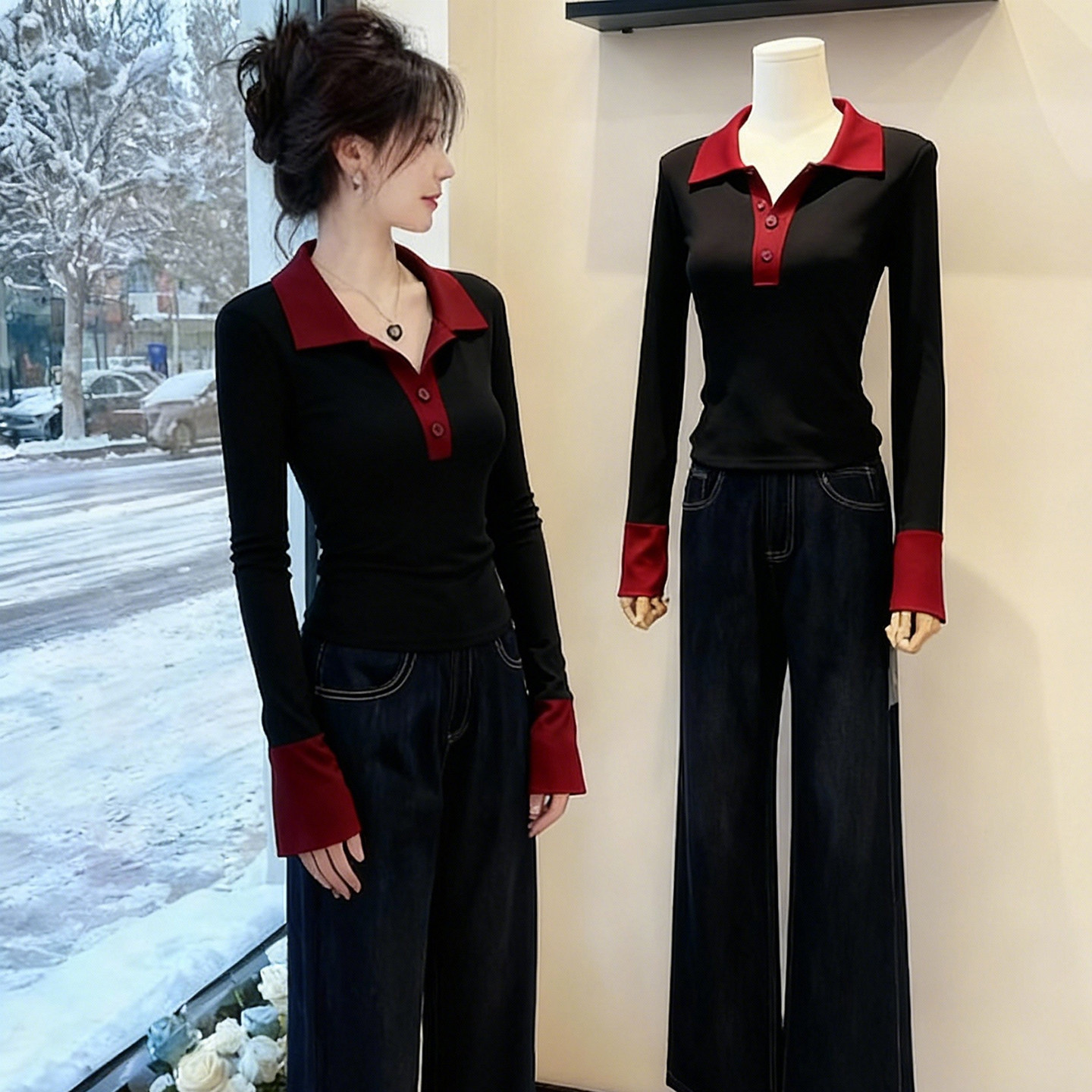 天猫性感纯欲Polo领拼色长袖T恤内搭打底衫女秋季新款修身显瘦上衣