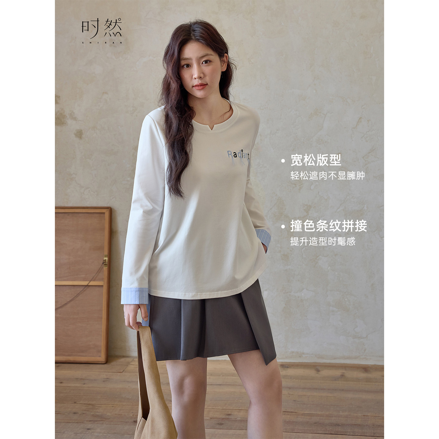 天猫时然大码女装撞色条纹拼接T恤26春季新款微胖mm显瘦圆领长袖上衣