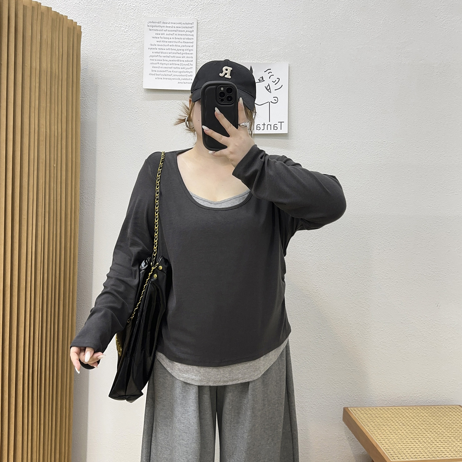 宛宛大码女装春秋季新款U领宽松面膜T恤胖mm打底衫内搭长袖上衣潮