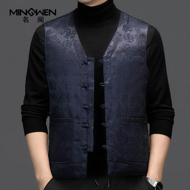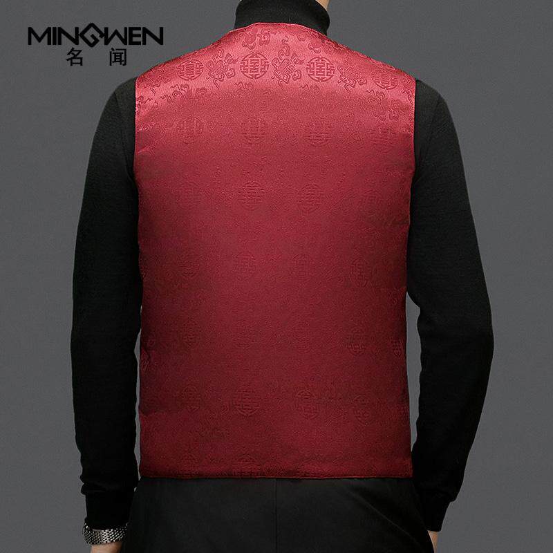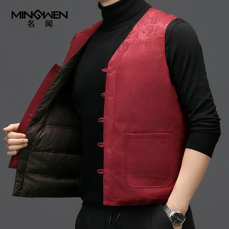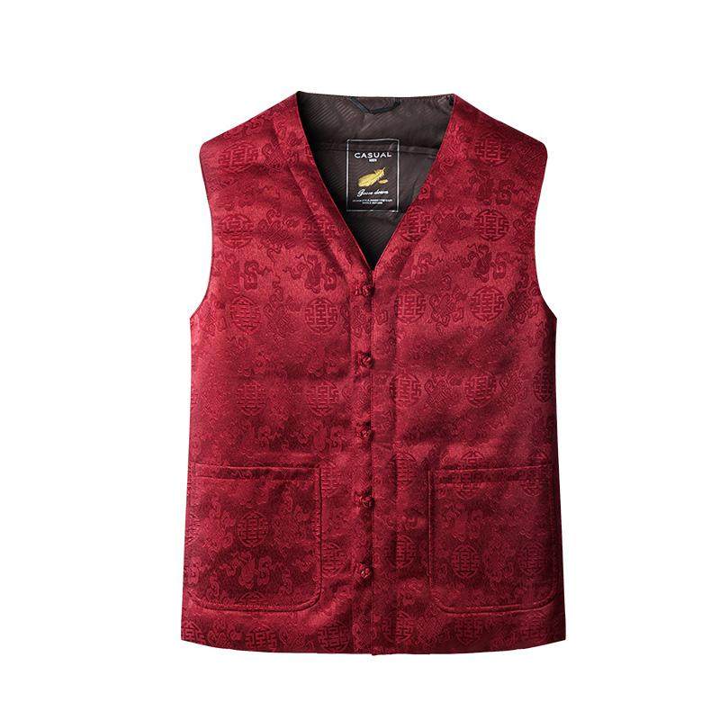 天猫新中式唐装羽绒马甲男冬季V领中国风印花保暖背心中老年马夹坎肩