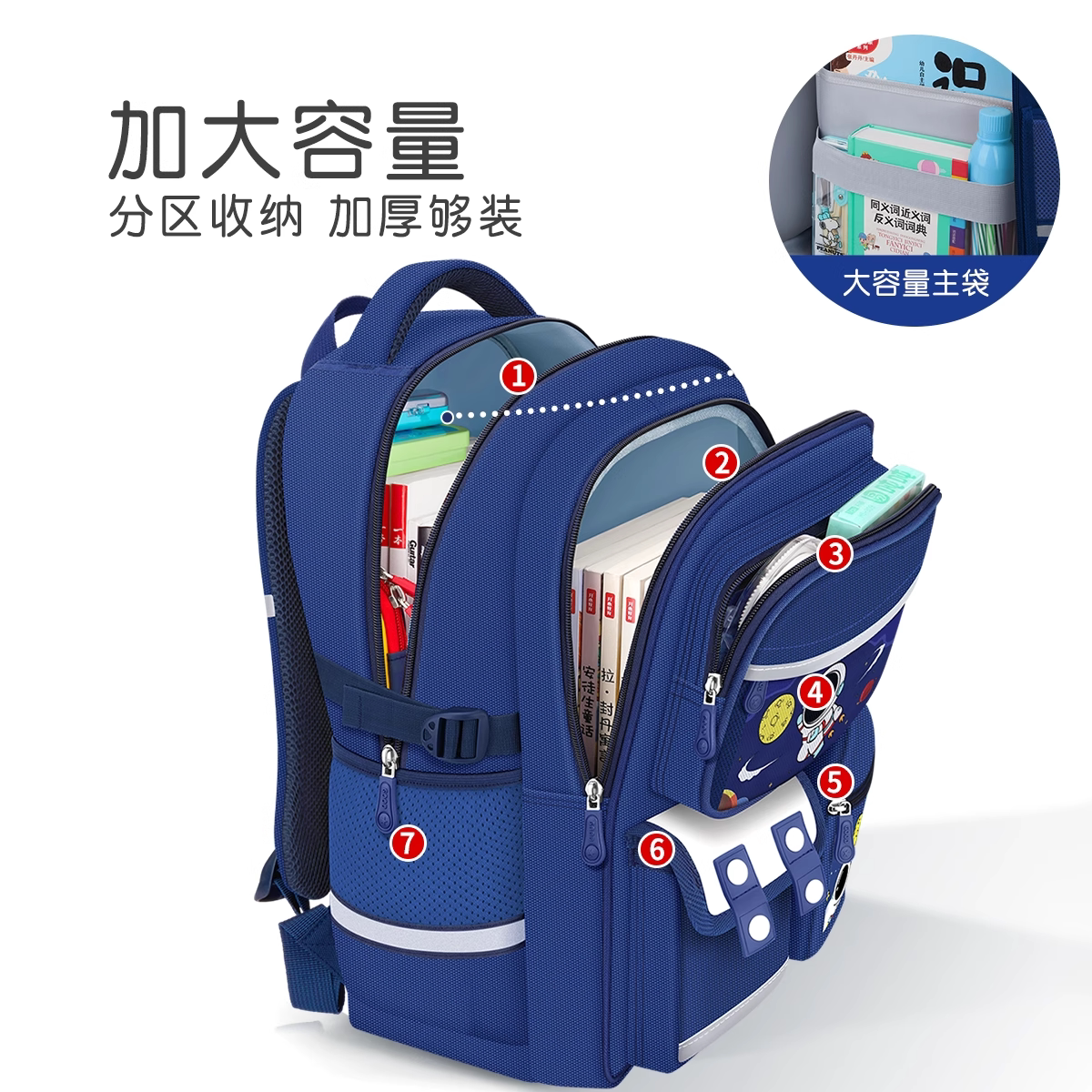 这款日本进口太空人小学生书包专为3-6年级男童设计,融合时尚与功能性。采用轻量化材质,有效减轻肩部负担,搭配符合人体工学的S型加宽背带和立体透气背垫,科学分散压力,护脊减负。书包内部结构分区合理,主袋、前袋、侧袋布局清晰,便于收纳课本、文具和水杯。外层防水耐磨,安全反光条提升夜间出行安全性。太空人主题图案童趣十足,激发孩子上学兴趣。整体设计兼顾健康、实用与美观,是低年级至中高年级男孩的理想学习伙伴,助力健康成长每一天。