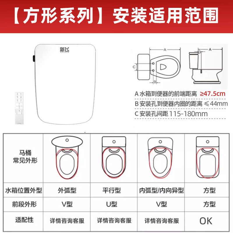 新飞方形智能马桶盖是一款专为方型马桶设计的全自动智能盖板,集加热、清洗、烘干等多功能于一体,适配多种家用方型马桶。采用即热式恒温供水技术,座圈智能加热,四季舒适如厕。配备多种清洗模式(臀洗、妇洗、移动清洗等),搭配柔和暖风烘干,洁净更贴心。抗菌材质座圈,有效抑菌,呵护家人健康。一键智能操作,支持自动感应开合与夜灯照明,便捷省心。节能环保,安装简便,无需更换马桶即可升级智能体验。新飞方形智能马桶盖,以科技提升生活品质,是现代家庭卫浴的理想之选。