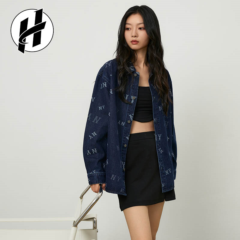 淘宝MLB男女情侣满印老花复古时尚牛仔衬衫外套休闲百搭长袖衬衫