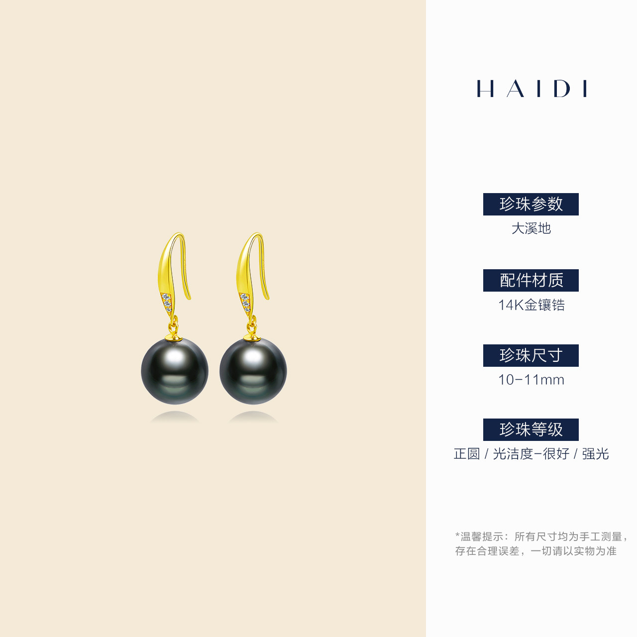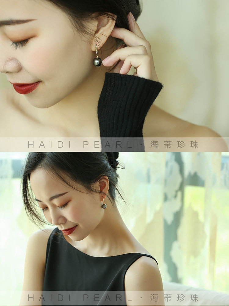 天猫海蒂珠宝 简默10-11mm大溪地黑珍珠耳环14K金耳饰正品送妈妈◇
