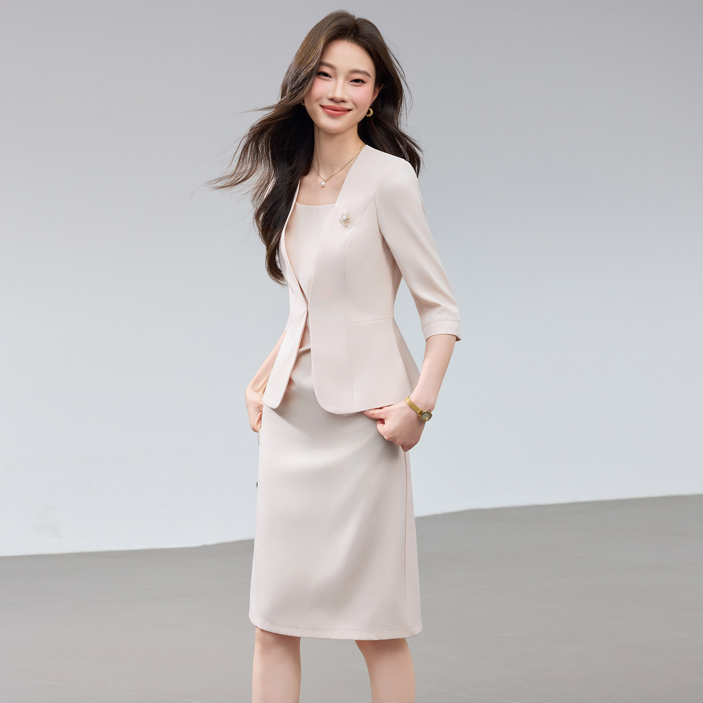 这款女士无领小西装外套,采用中袖薄款设计,剪裁修身,完美贴合身形,凸显优雅气质与干练风范。无领设计简约大方,打破传统西服的沉闷感,更显时尚利落。搭配同色系无袖连衣裙,整体造型协调统一,适合职场通勤、商务会议或轻熟社交场合。面料轻盈透气,穿着舒适,兼具挺括感与垂坠感,视觉上有效显瘦。套装设计省去搭配烦恼,轻松打造知性、精致的女性形象,是现代职场女性的理想之选,既展现专业态度,又不失柔美魅力。