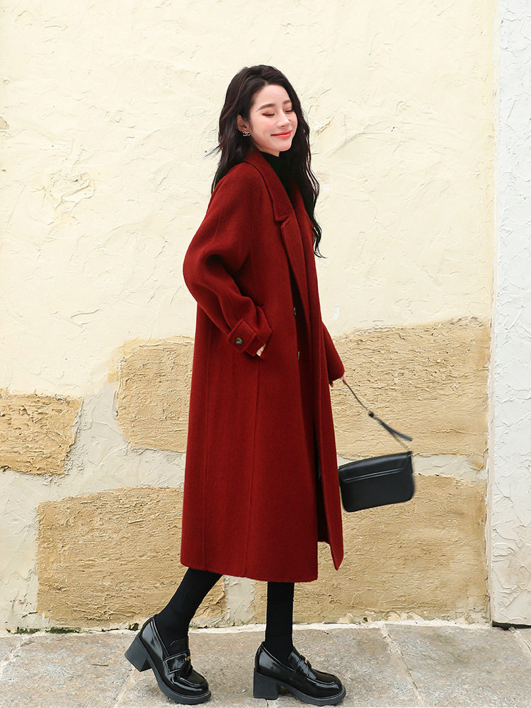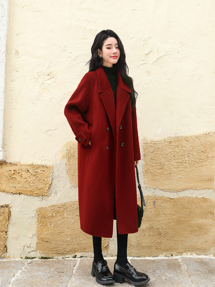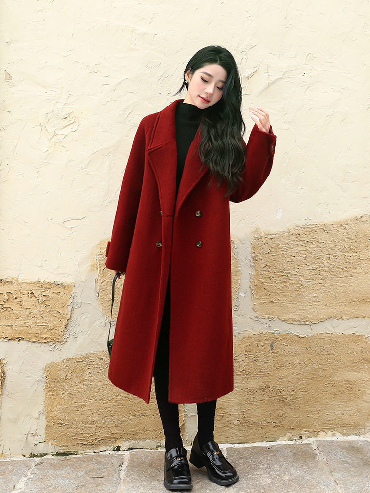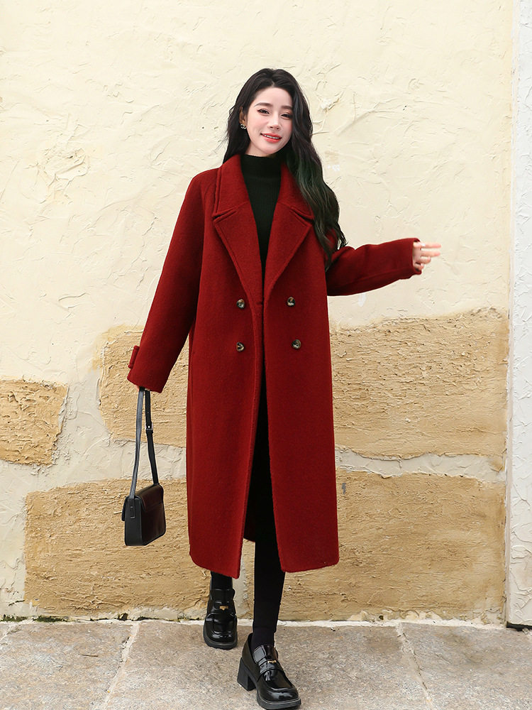 淘宝大码新款宽松西装毛呢大衣胖MM长款秋冬新年红色呢子外套女显瘦厚