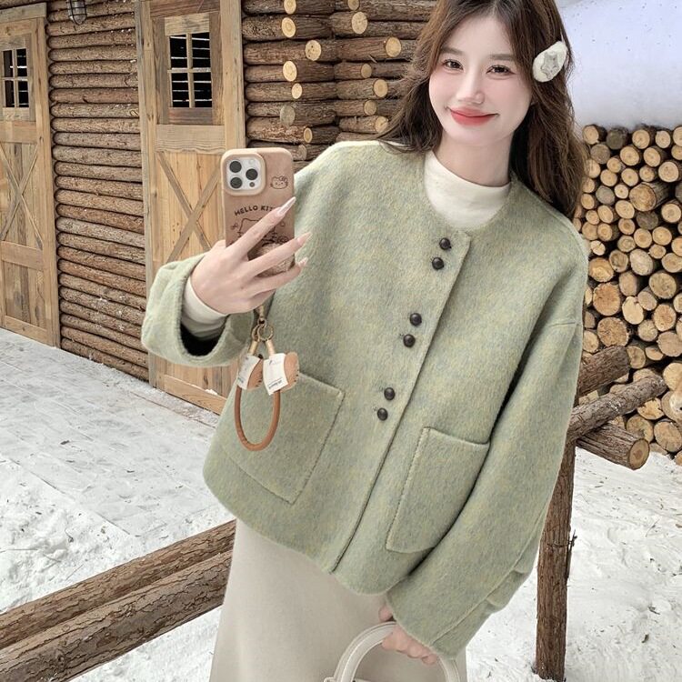 淘宝爱迷鹿小香风绿色单面呢小个子外套女春冬短款感韩系气质
