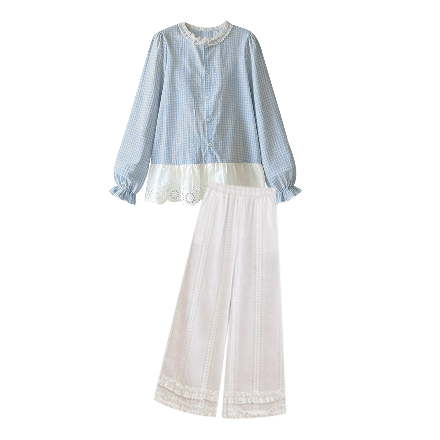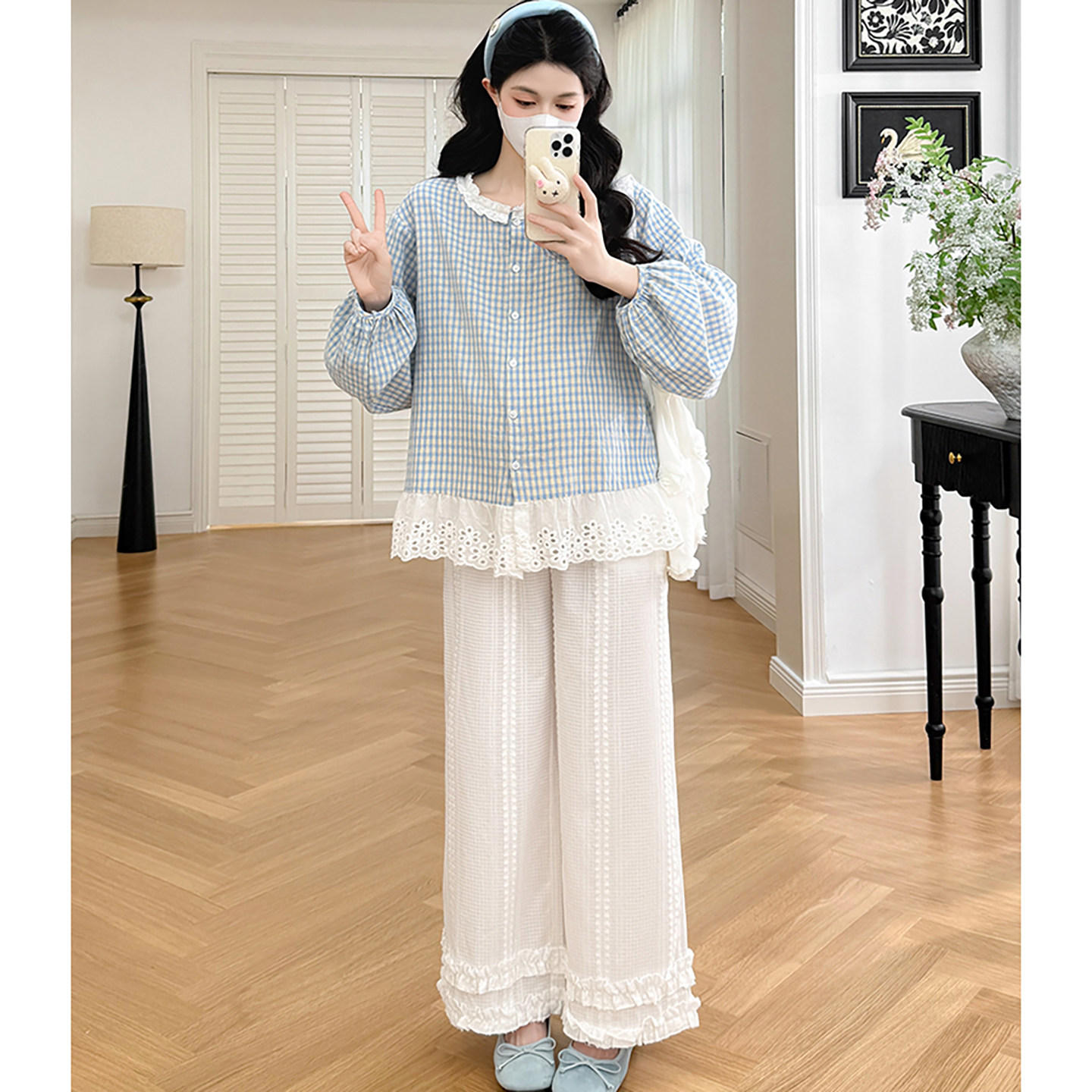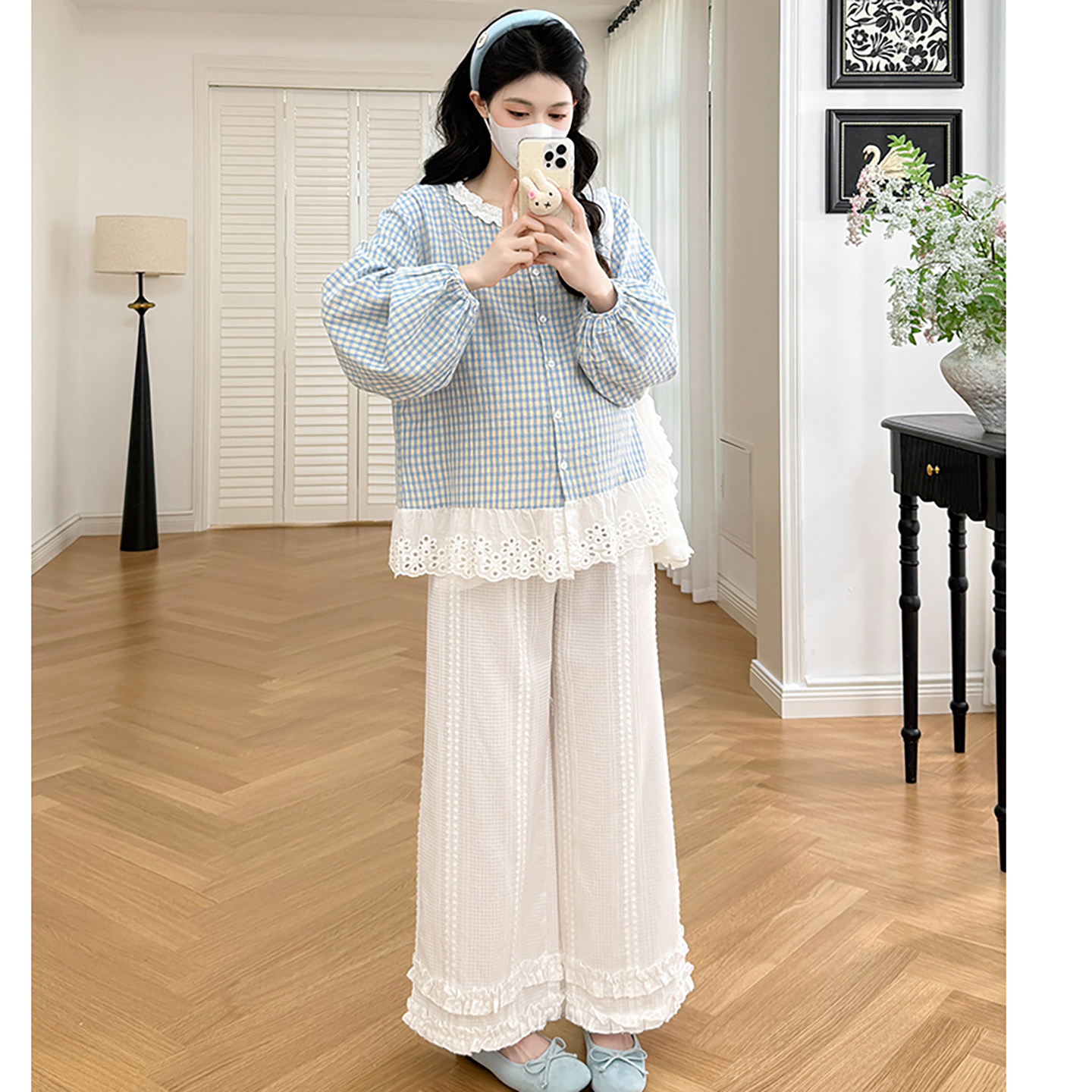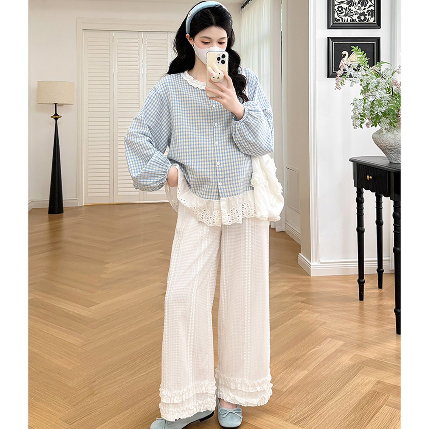 淘宝孕妇套装春秋2026新款韩版蓝色格子减龄拼接蕾丝衬衫裤子两件套女