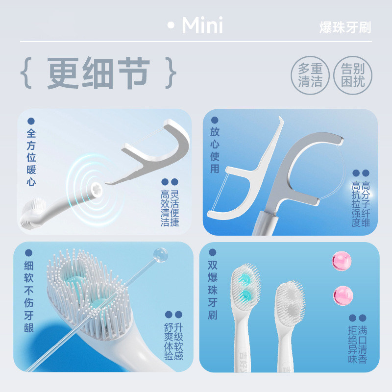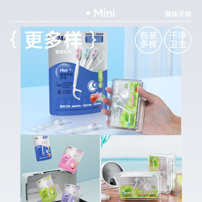 这款旅行便携式双爆珠牙刷,专为出差、旅行及日常外出设计,轻巧便携,一次性使用更卫生。牙刷内置双爆珠,轻轻一咬即释放清新薄荷精华,有效去渍、杀菌并持久清新口气。刷头采用软毛设计,温和清洁成人及儿童牙缝,搭配独立牙线装置,轻松清除食物残渣,呵护牙龈健康。独立包装,防水防潮,可随身携带上飞机,是差旅、露营、办公室备用的理想选择。无需水杯即可刷牙,环保便捷,让清新时刻随行,随时随地守护口腔健康,是现代快节奏生活中的贴心口腔护理伴侣。