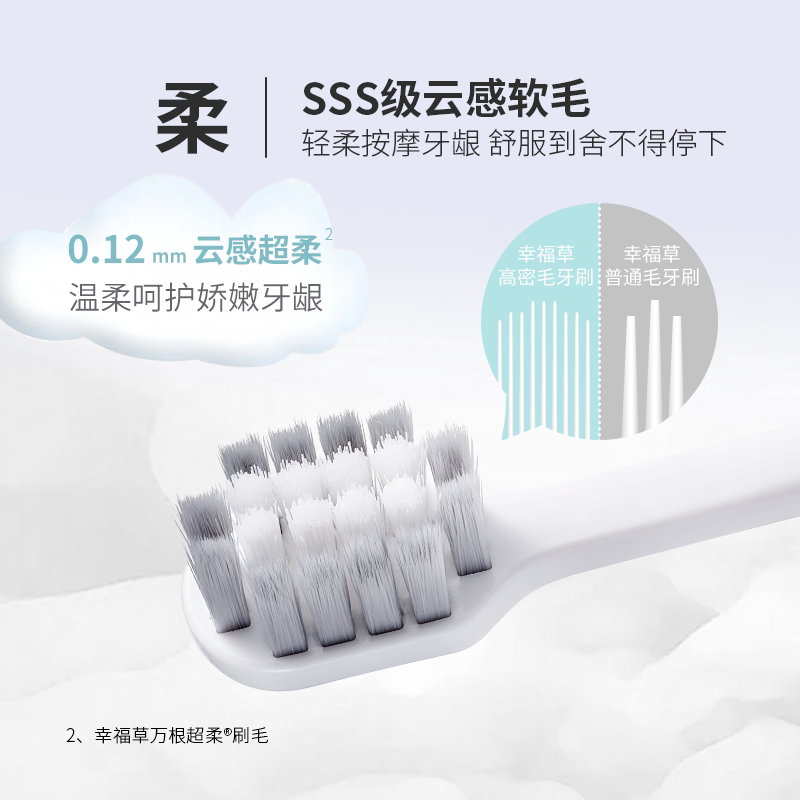 幸福草灵动万根超柔护理牙刷,采用方孔高密设计,植毛量提升30%,清洁更彻底。刷毛选用0.12mm超细软毛,搭配天然炭丝成分,深入齿缝清洁的同时温和按摩牙龈,有效减少出血与敏感。万根超柔刷毛如云朵般贴合牙面,呵护娇嫩口腔,适合敏感人群日常使用。人体工学防滑手柄,握感舒适,刷牙更省力。现推出限时5折优惠,全国包邮,性价比超高。无论是日常护理还是牙龈敏感者,幸福草牙刷都是理想之选,让每一次刷牙都成为舒适享受,守护全家口腔健康。