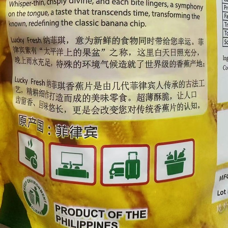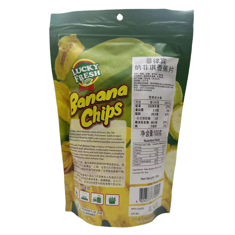 LUCKYFRESH纳菲琪香蕉片是菲律宾原装进口的特色果干零食,精选当地优质香蕉为原料,采用先进低温脱水工艺制作,最大程度保留香蕉的天然香甜与营养成分。口感酥脆不腻,外焦里嫩,带有浓郁的热带水果风味,是健康与美味兼具的休闲佳品。无人工色素、无防腐剂,适合办公室、居家、旅行等多种场景享用。无论是作为下午茶点心,还是搭配酸奶、沙拉,都能带来愉悦的味蕾体验。LUCKYFRESH纳菲琪香蕉干,让每一口都充满阳光般的热带风情,是追求品质生活的理想零食选择。