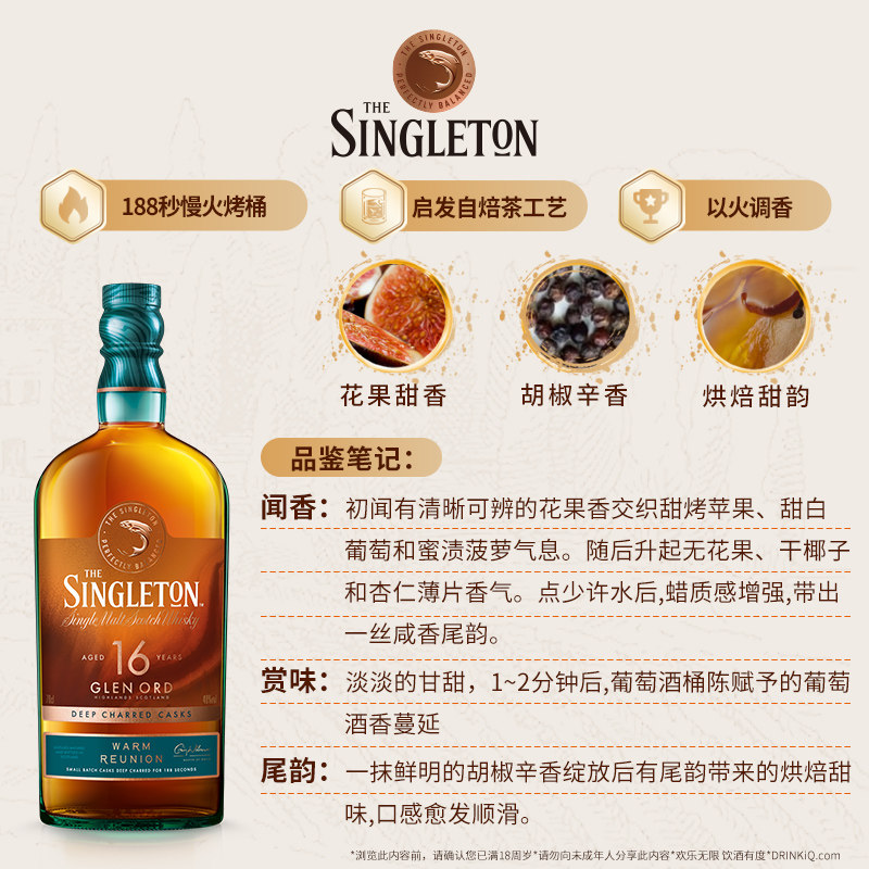 【官方正品】帝亚吉欧苏格登16年慢火烤桶调香单麦威士忌700ml,源自苏格兰斯佩塞核心产区,精选优质大麦与天然泉水,经传统铜壶蒸馏,于经慢火烘烤的美国橡木桶中悉心陈酿16年。独特的烤桶工艺赋予酒液深邃的香草、焦糖与淡淡烟熏气息,融合成熟梨果、蜂蜜与香料层次,口感圆润饱满,余韵悠长。苏格登坚持“慢工艺”理念,每一瓶都承载时光淬炼的匠心。官方授权,品质保证,是品鉴收藏与高端赠礼的理想之选。700ml标准装,琥珀色泽晶莹剔透,香气复杂而平衡,尽显单麦威士忌的优雅风范。