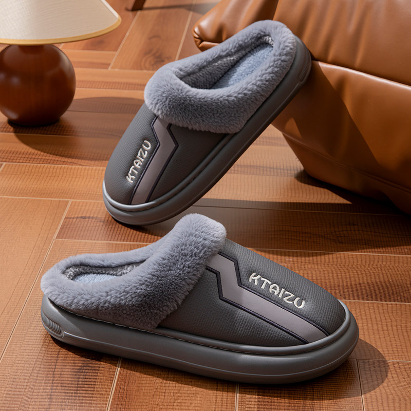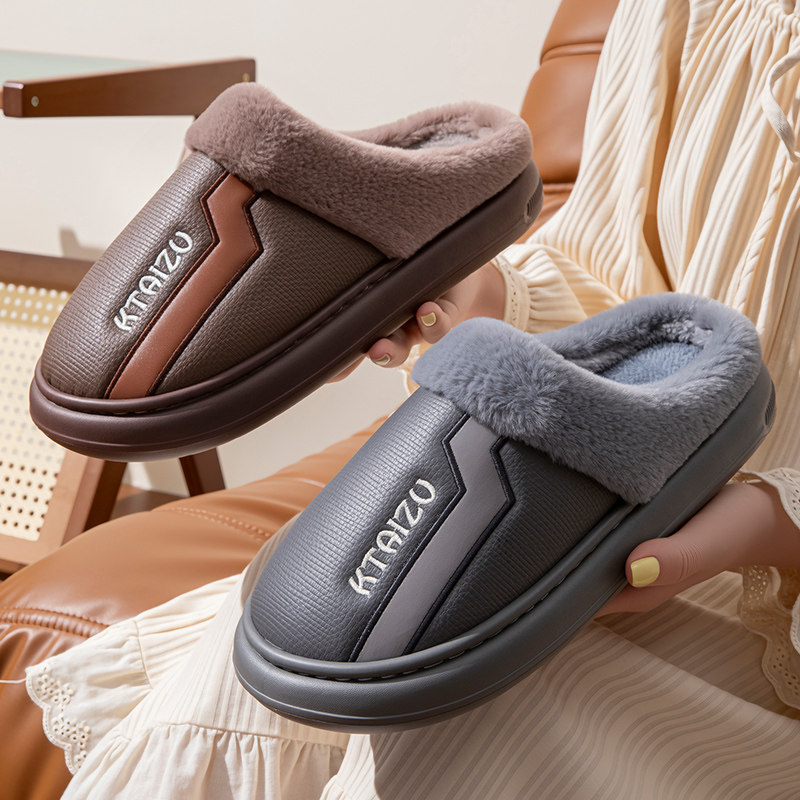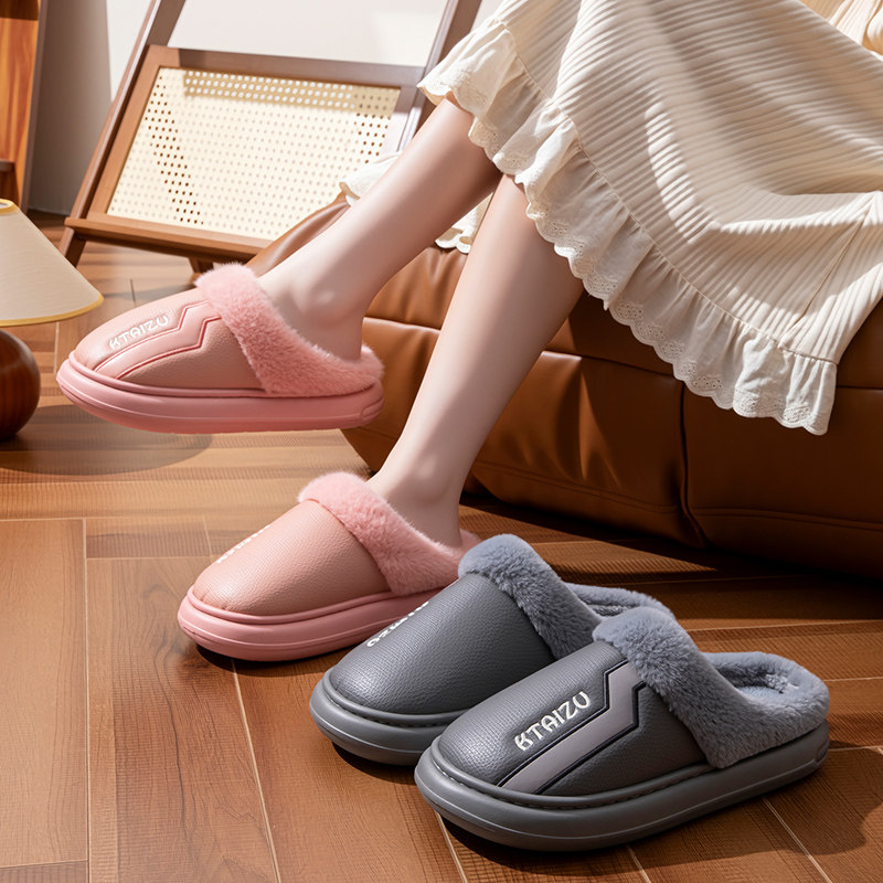 淘宝PU皮棉拖鞋男款冬季室内家居保暖加绒厚底防滑棉拖女款防水外穿