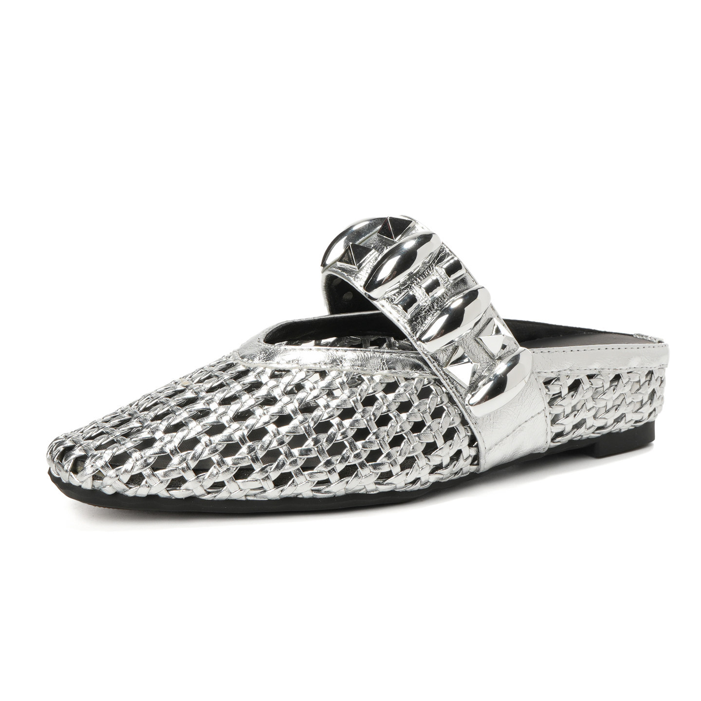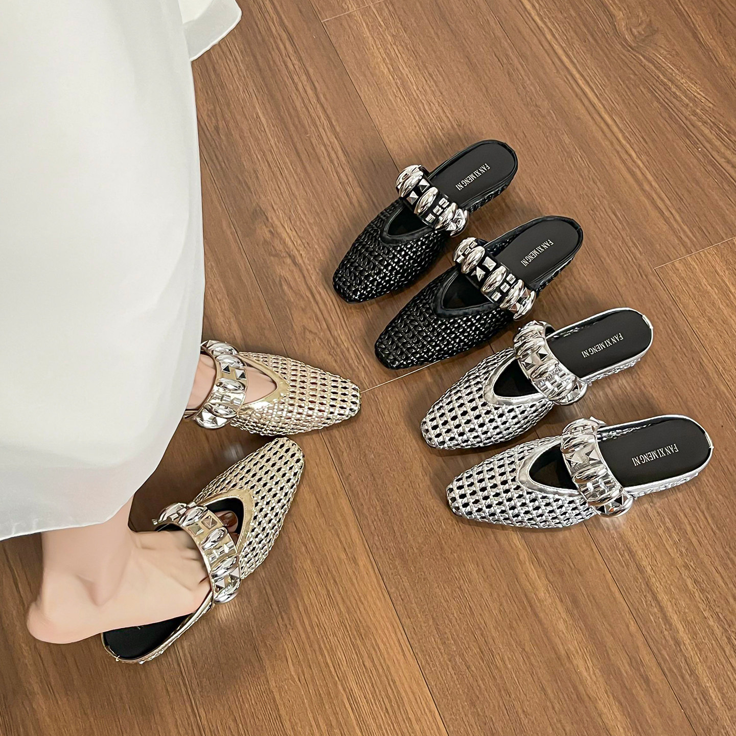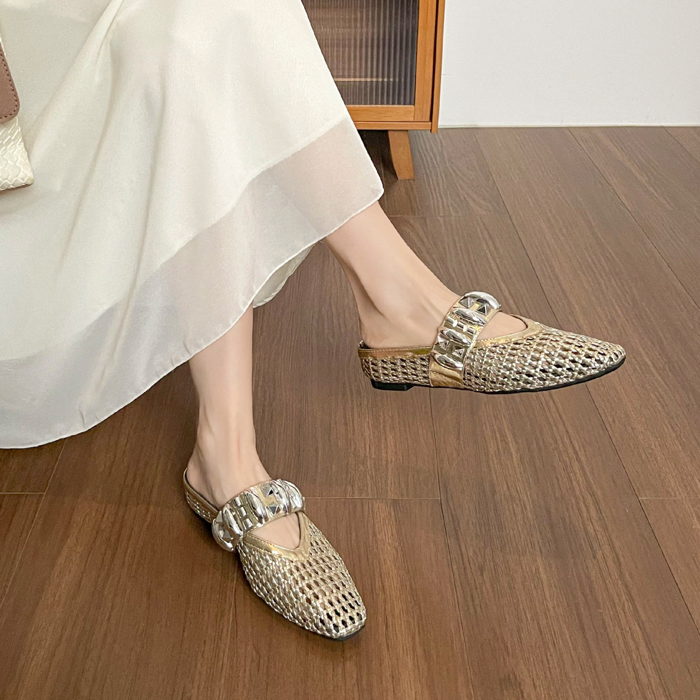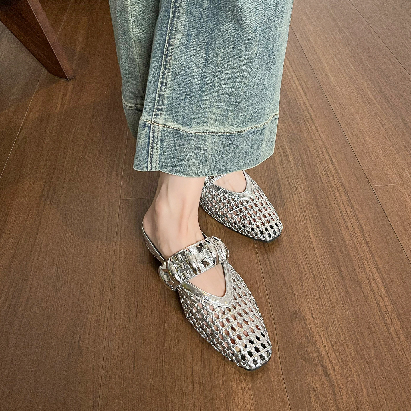 淘宝羊皮版~手工编织镂空凉拖鞋女夏外穿银色透气包头半拖鞋大码女鞋