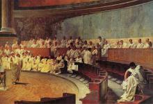 古罗马共和国的元老院中正在选举前63年的执政官。一位口若悬河、声色俱厉的青年人正在向着所有元老院中的元老与执政官候选人发表者演说。向着另外一名热门候选人喀提林进行了猛烈的抨击,从而让喀提林的阴谋无所遁形。他就是罗马共和国末期著名的雄辩家、政治家和哲学家——西塞罗。喀提林啊……你不知道你的计划已经暴露“由于在场各位元老都已知道了这件事,而你的阴谋已紧紧地被制服住,