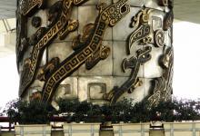 申字形立交桥的中心点立着一根盘有龙形雕塑的金属巨柱。说是由于高架桥当年施工的时候把桩子打到了“据说是在当初施工的时候在那打桩可怎么也打不下去。老方丈看了后说这地方是上海的龙头所以没法打下去。于是施工方就按照老方丈的意思做果然打下去了。老方丈说必须在建完的柱子上包上龙,于是就有了上海高架中唯一一根包龙的柱子了。在建造延安中路高架的过程中,字中心点的一根柱子无法打桩“